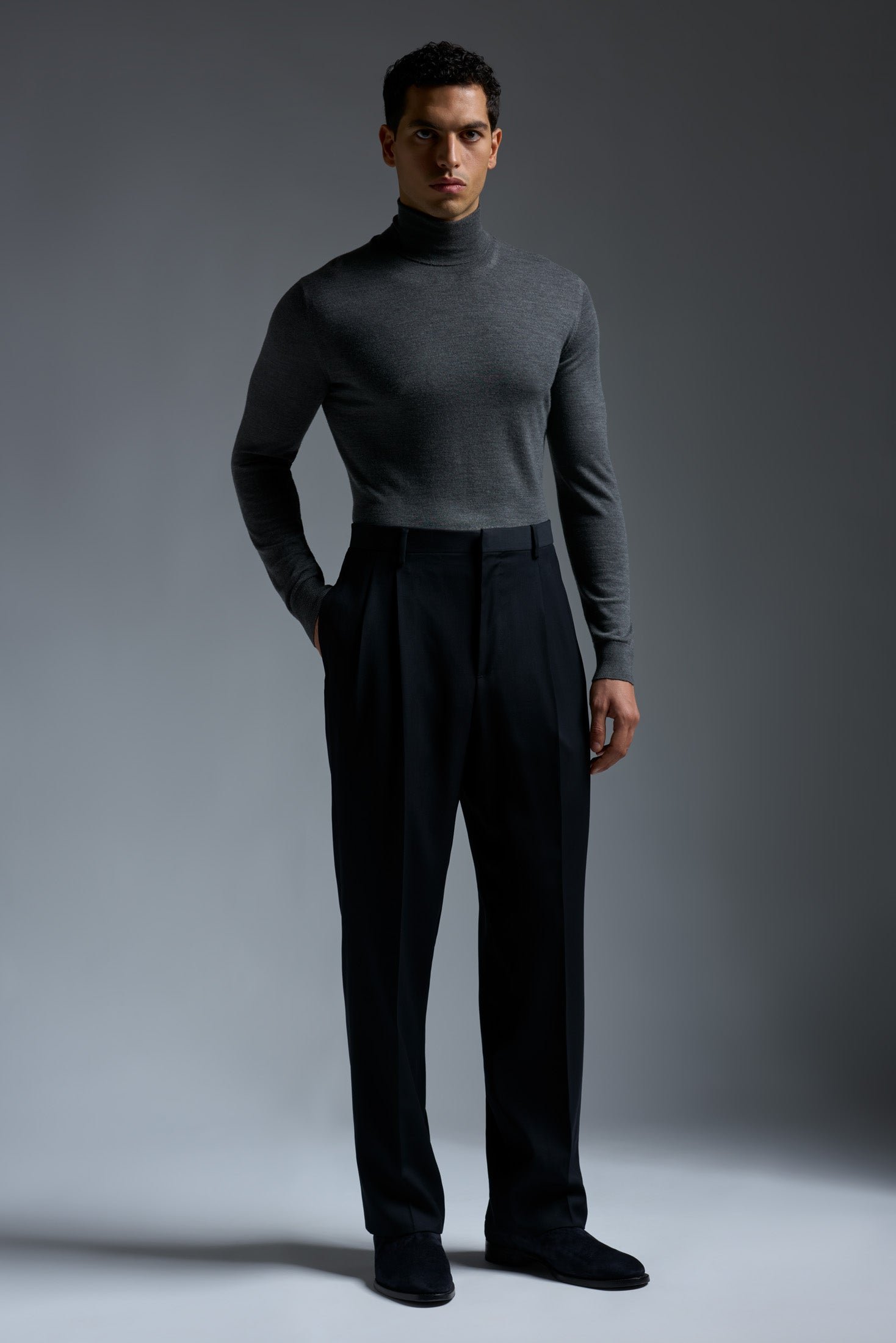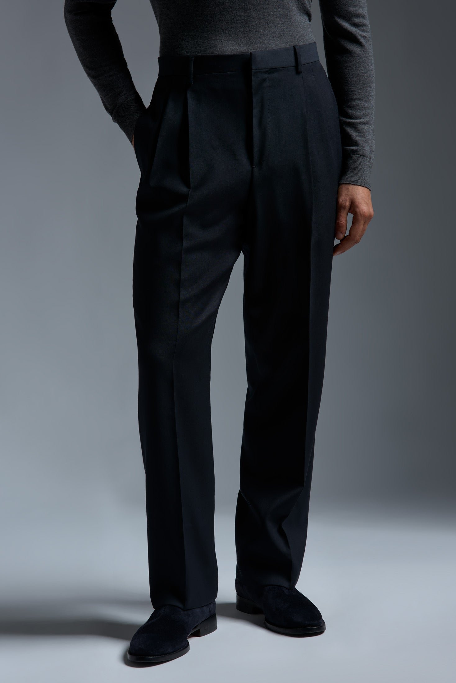 A timeless essential for any tailored wardrobe. this double pleated trouser features a straight leg for an elegant. balanced silhouette. The double pleats add comfort and ease through the hip. while the crisp crease keeps the look sharp from desk to dinner. Pair it effortlessly with a dress shirt and blazer for understated sophistication.